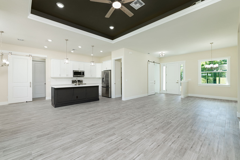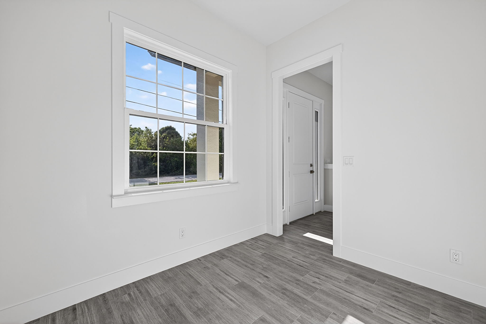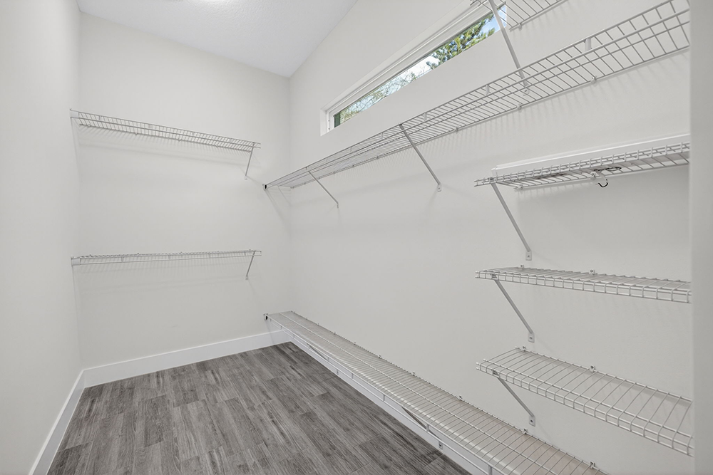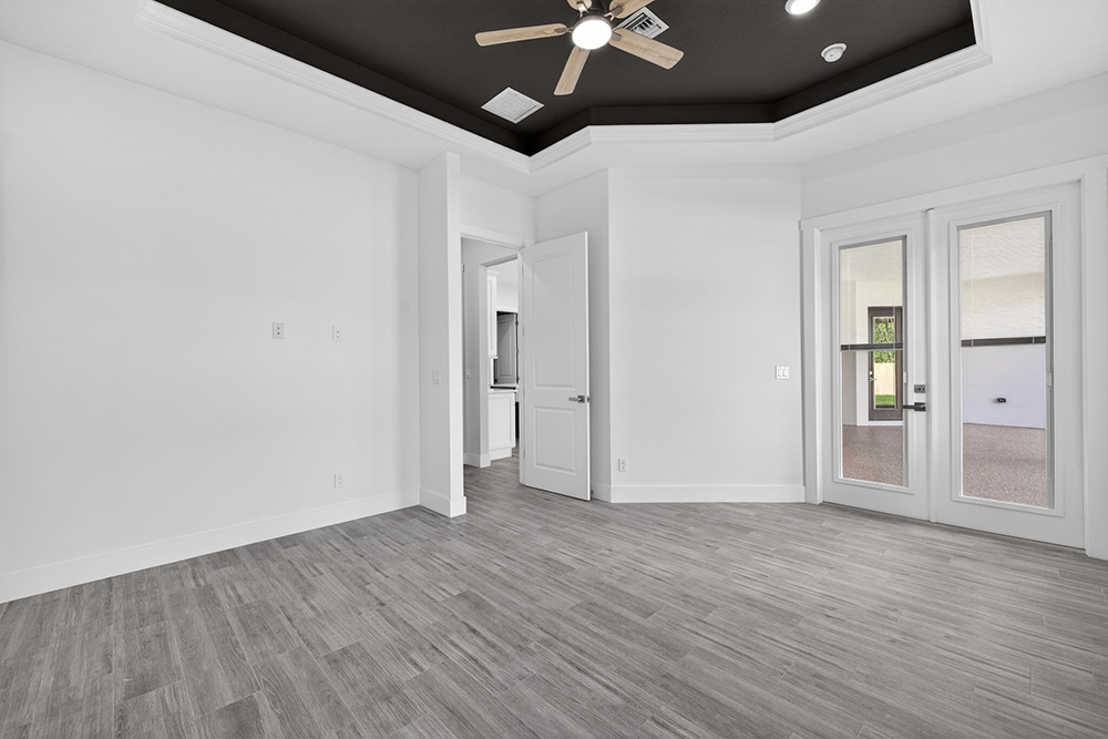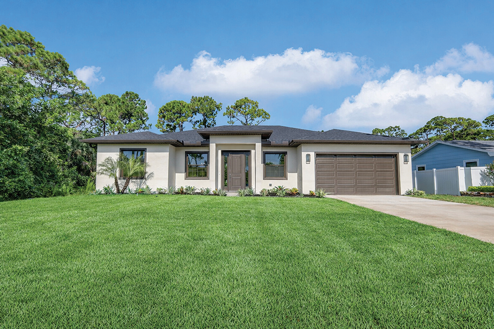 A 60-foot-wide ranch design with a private 3/3 guest or teen suite, impact windows, stacking sliders, and 8-foot French doors with built-in blinds. Open kitchen with oversized island; 42-inch, soft-close cabinetry; quartz throughout; a 5-foot soaking tub; laundry cabinetry; 8-foot interior and garage doors; dedicated office; walk-in kitchen pantry and closets; 10-foot–11-foot ceilings; custom trim detail; barn doors; and gutters.