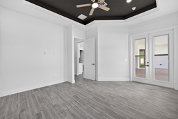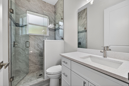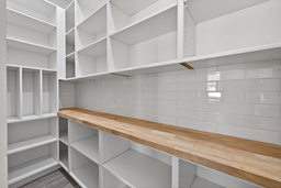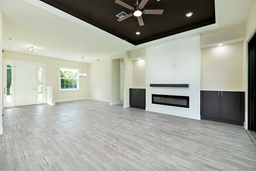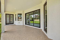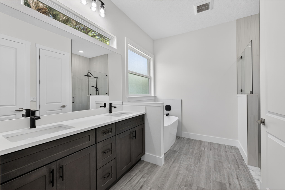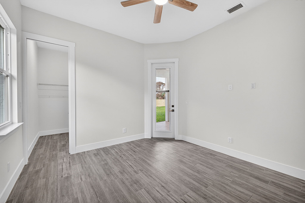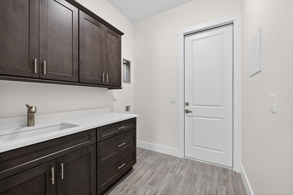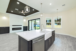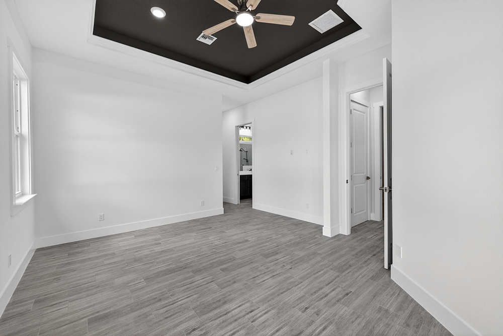 A 60-foot-wide ranch design with a private 3/3 guest or teen suite, impact windows, stacking sliders, and 8-foot French doors with built-in blinds. Open kitchen with oversized island; 42-inch, soft-close cabinetry; quartz throughout; a 5-foot soaking tub; laundry cabinetry; 8-foot interior and garage doors; dedicated office; walk-in kitchen pantry and closets; 10-foot–11-foot ceilings; custom trim detail; barn doors; and gutters.