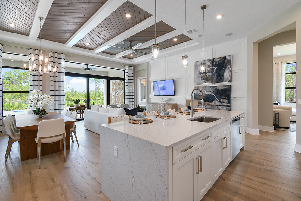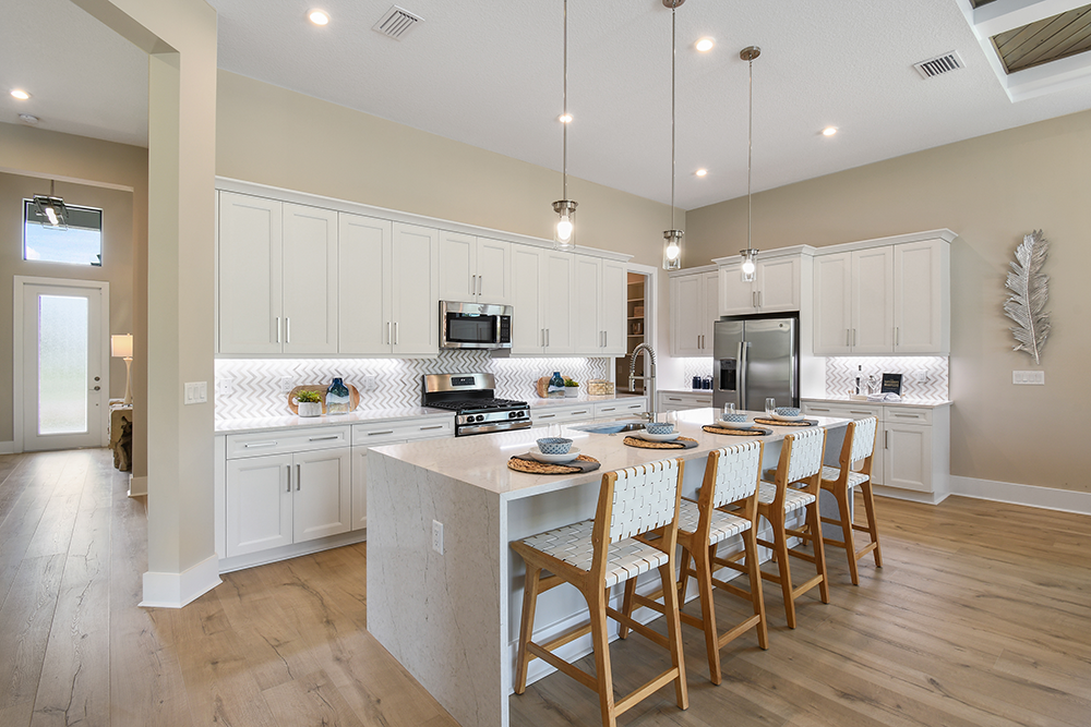 The kitchen serves as the command center of the Julia floor plan. For the chef in the family, there’s lots of space to work and house your tools of the trade with substantial countertop area, cabinetry, and pantry. From the island, the view opens up, light and bright, across the dining area and great room, out to the covered lanai.