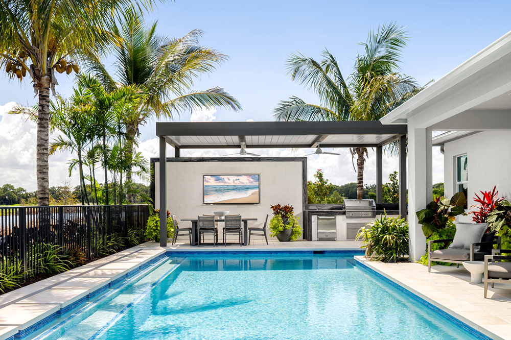 This three-bedroom home includes a dedicated office space and a three-car garage. It features expansive outdoor living and entertainment areas with pond views, including an oversized pool, a large pergola, and an outdoor kitchen with dining space. Additional highlights include durable block construction, high-impact windows, and a location approximately 0.5 miles from the Intracoastal Waterway.