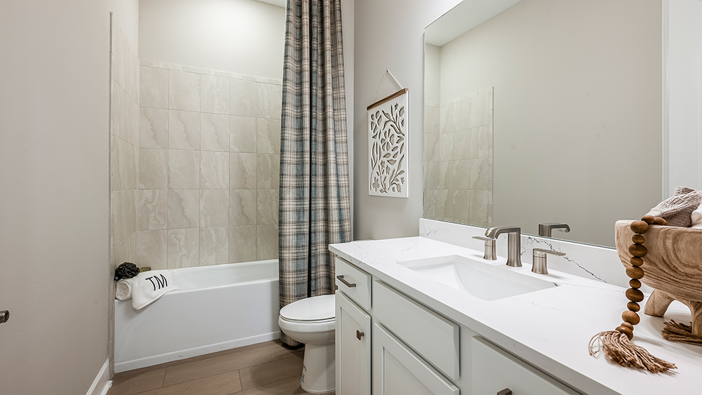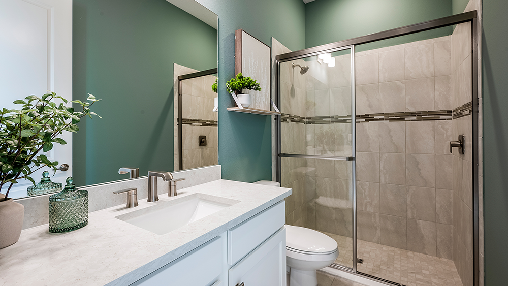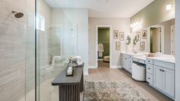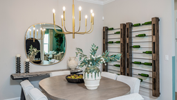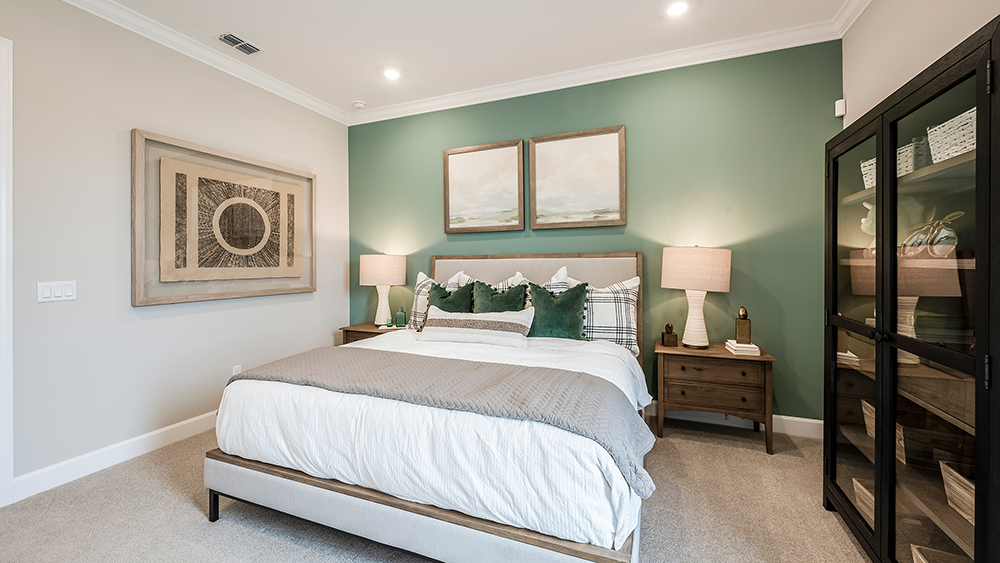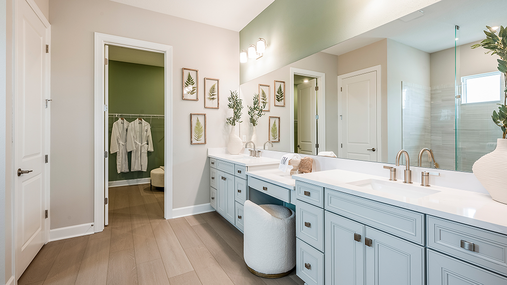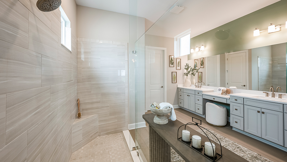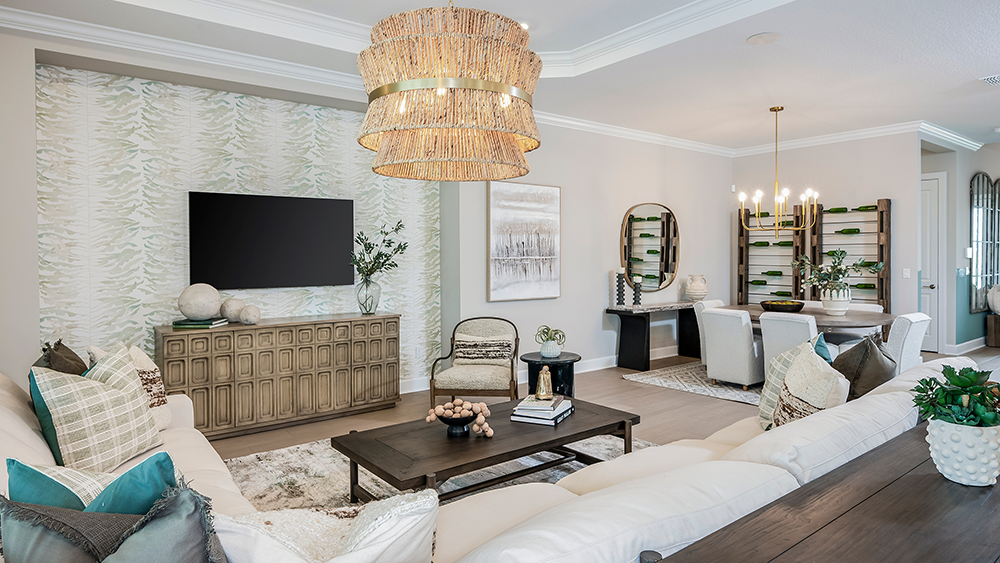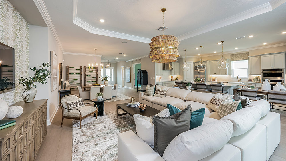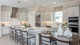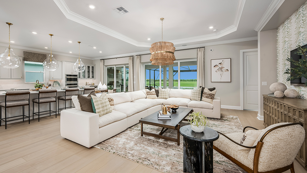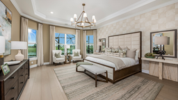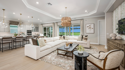 The open-concept Pallazio home design features ample square footage, a sparkling pool with spa, and picturesque views of the water behind the home. There is a gourmet kitchen with GE Monogram appliances, a large island with extended space for casual dining, plus upgraded quartz countertops and cabinetry.